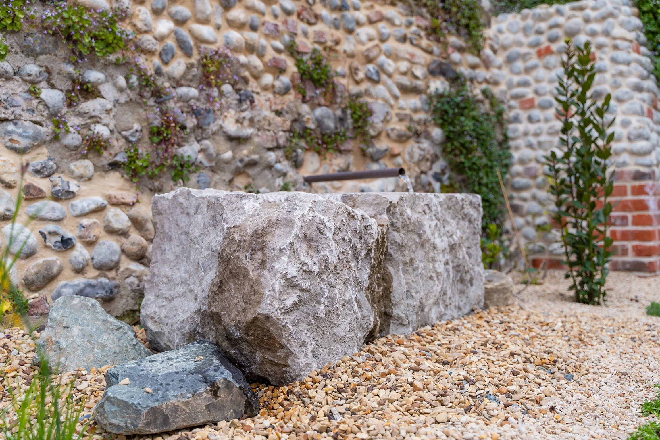 Completed in April 2024, with a bespoke limestone carved water feature, harmonious united colour pallet across the hard and soft landscaping, this design maximises on the complicated level changes. Rather than leaving a single staircase between garden zones, we have curated large and inviting platforms that gradually lead you through the space. We’ve introduced large monolithic glacial boulders, scribing these into paths and patios to create a sense of permanence and heritage to the site.