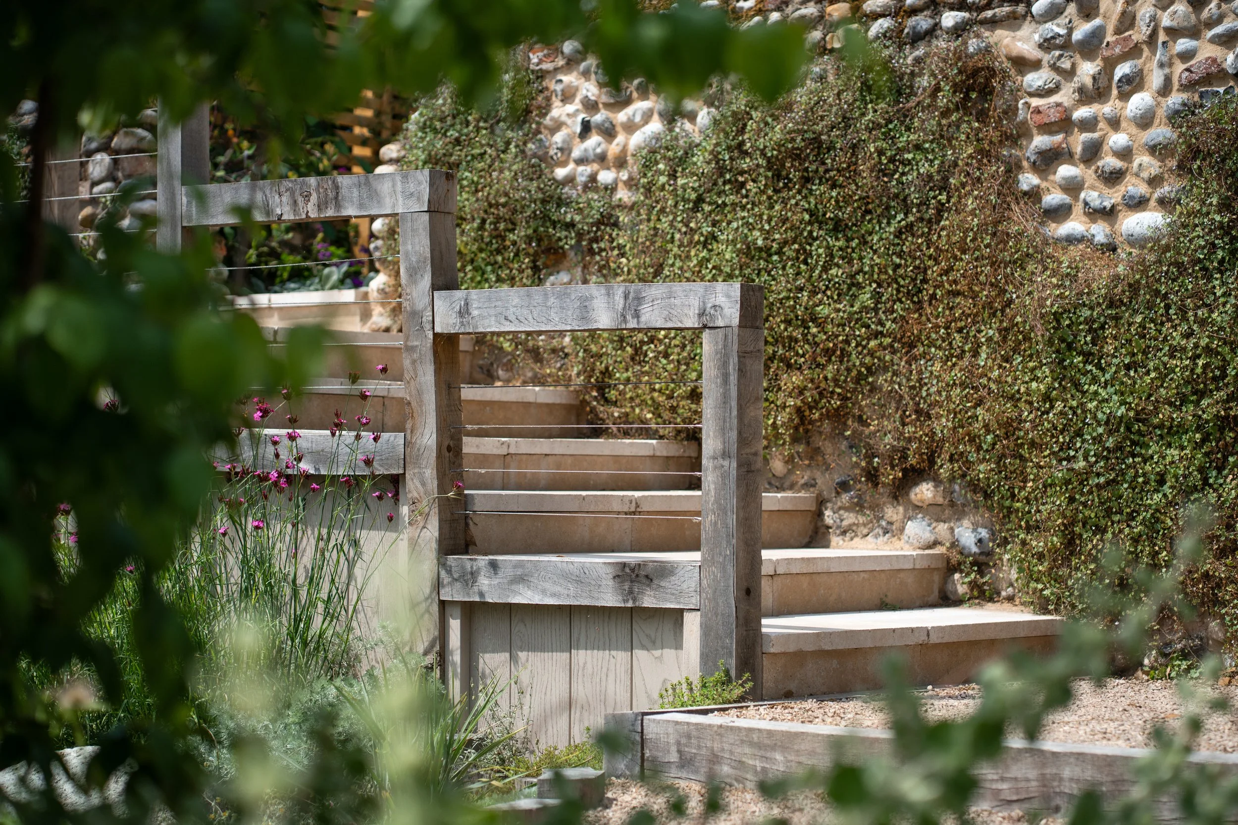 This multi-level coastal garden unites sprawling buildings with a purposeful journey. Beginning with a private sanctuary at the highest point, informal gravel planting leads to an oak and limestone staircase, boasting views across the picturesque Glaven Valley. The journey continues down into a flint-walled garden courtyard.