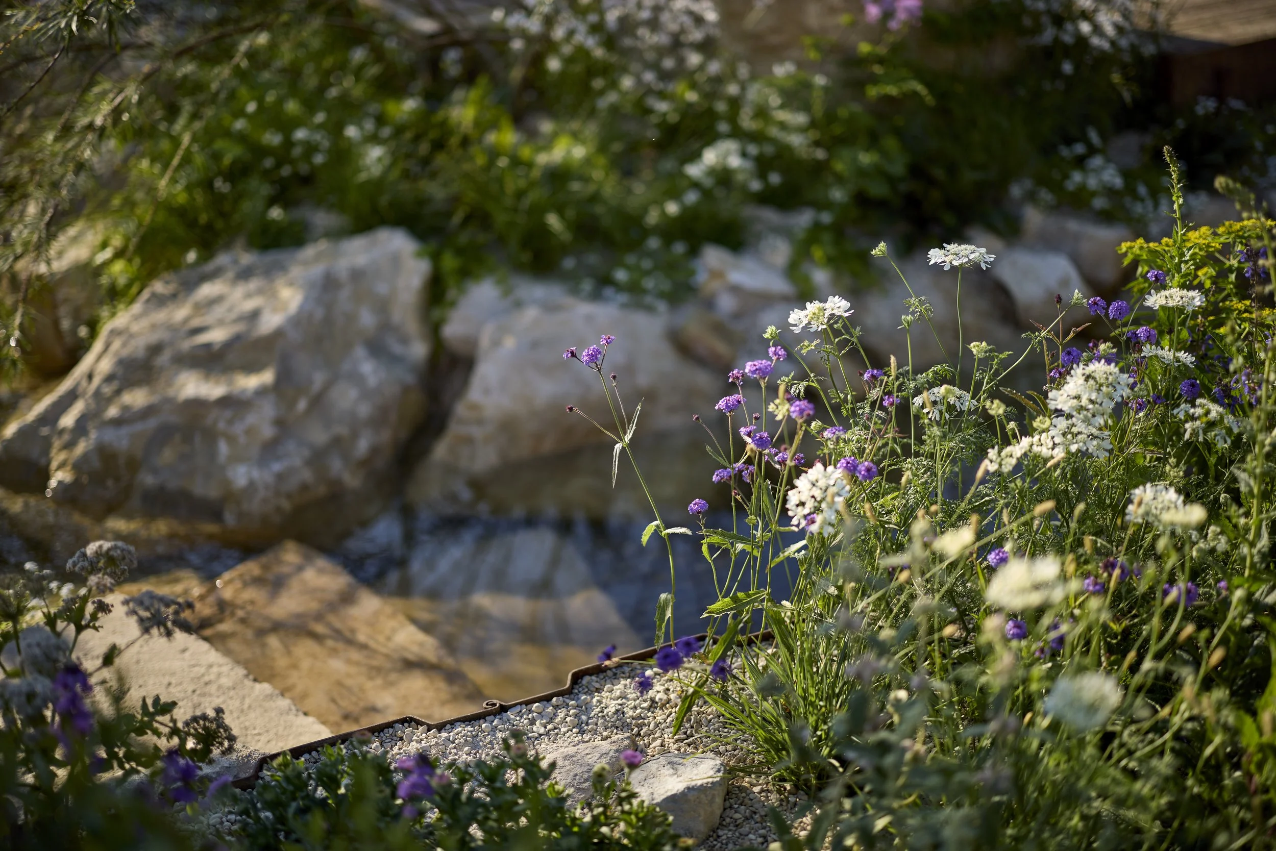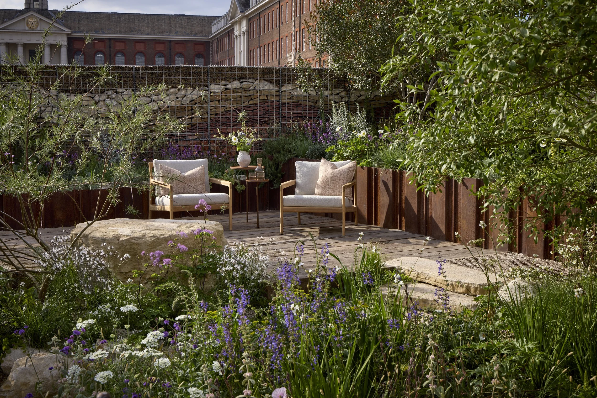 Taking its cue from the landscape of North Norfolk, with layered gabions to represent coastal cliffs and a sandy toned planting palette. This garden explores the themes of slowing down and spending time in a natural environment.